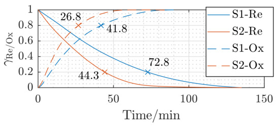 Effect of the pellet size of S1 () and S2 () on the temporal reduction (–) and oxidation (- -) fractions at a reactant flow rate of and the gas concentration (cf. Table 2).