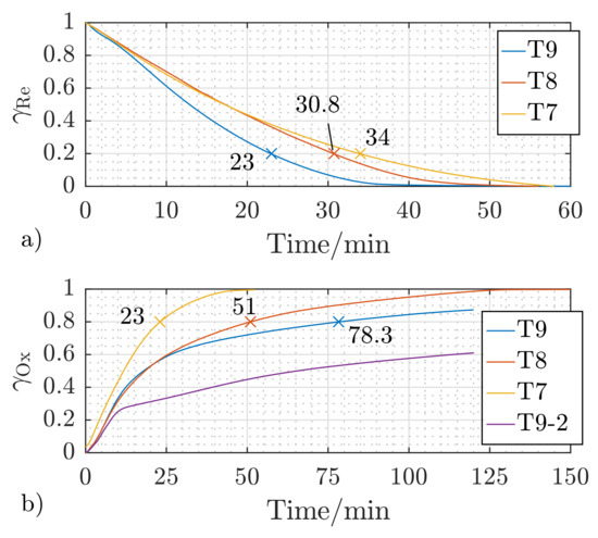 with as the sample weight at time t, as the starting or smallest weight, and as the highest or final weight during the respective reduction/oxidation phase. To evaluate the obtained reaction kinetic curves, the time needed to achieve an oxidation fraction of or a reduction fraction of is chosen.