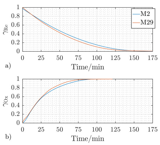 Reaction behavior of S1 after two (M2) and 29 (M29) redox cycles at a reactant flow rate of , reaction temperature of , and the gas concentration (cf. Table 2) for reduction (a) and oxidation (b).