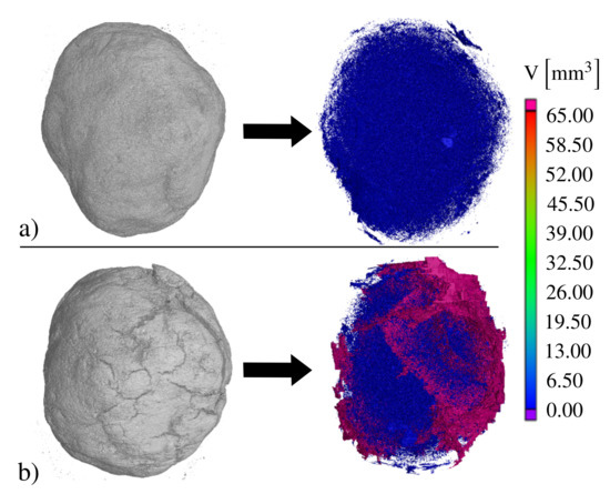 CT-images of S1 (a) complete image and blank volume before the TGA investigations and (b) complete image and blank volume after 29 redox cycles.