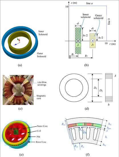 Figure 1c shows a prototype of a high-frequency transformer with Litz-wire windings and a magnetic core made of nanocrystalline films. High-frequency transformers have many potential and promising applications, including in the power systems and wireless power transmission systems [26,27,28]. For the design optimization of a high-frequency transformer, there are many objectives, such as minimizing the loss and volume. Regarding the design optimization parameters, dimensions (as shown in Figure 1d) and core materials (like nanocrystalline or amorphous) can be considered [29,30,31,32]. Detailed optimization models can be referred to these works as well.
