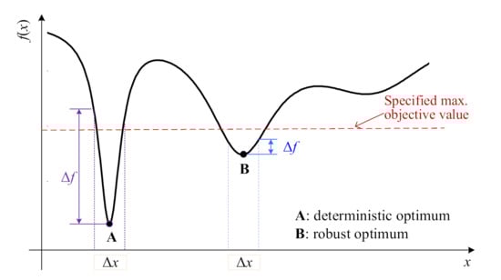 A comparison between the deterministic optimum and robust optimum in the presence of uncertainties for a function f(x), in which ∆x and ∆f stand for the variations of the parameter and objective, respectively.