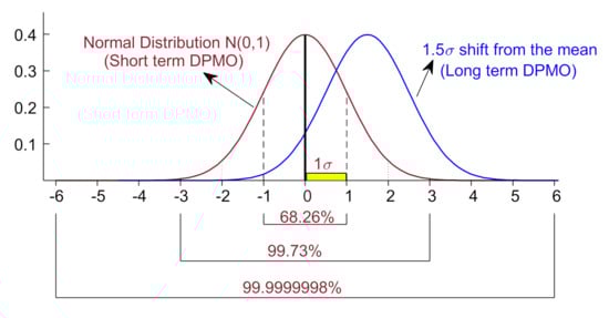 where μ and σ are the mean and standard deviation, respectively, are the mean and standard deviation, respectively, are the mean and standard deviation of x, respectively, LSL and USL are the lower and upper specification limits, respectively. n is the sigma level, and it is defined as 6 in many applications. The value of n can be equivalent to a probability of a normal distribution, as shown in Figure 5. Six-sigma level (n = 6) has been widely adopted in industry as it can provide good reliability for both short-term quality control (equivalent to statistic values) and long-term quality control (with considerations of uncertainties by shifting mean with 1.5 σ). It is equivalent to 0.002 (or a per cent of pass 99.9999998%) for short-term quality control and 3.4 defects per million opportunities (DPMO) for long-term quality control [6,14,48].