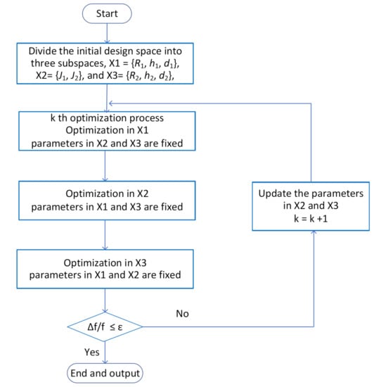 For the multilevel optimization strategy, a high-dimensional optimization problem is converted into several low-dimensional optimization problems by using sensitivity analysis techniques, such as local sensitivity and analysis of variance. Considering the optimization of SMES with 8 parameters, a three-level structure can be defined as: Level 1 (3 parameters of [R1, h1, d1]), Level 2 (2 parameters of [J1, J2]), or Level 3 (3 parameters of [R2, h2, d2]). To implement the optimization, a sequential optimization process, Level 1–Level 2–Level 3, will be conducted, as shown in Figure 6. This process should be repeated until a convergence criterion is met (for example, the relative error of the objectives between two iterations are no more than a given value ε like 1%). This kind of optimization strategy will decrease the computation cost, as the optimization of each level is a low-dimensional problem which can be done effectively by a surrogate model. For example, if each factor needs 5 levels in a DoE technique, then Level 1 requires 125 points, Level 2 requires 25 points, and Level 3 requires 125 FEM points, resulting in a total of 275 points for one loop of the optimization. If three optimization loops are needed, a total of 825 points are required for multilevel optimization. This is much smaller than the samples (125 × 125 × 25 = 390,625) required by developing a model for 8 input parameters.
