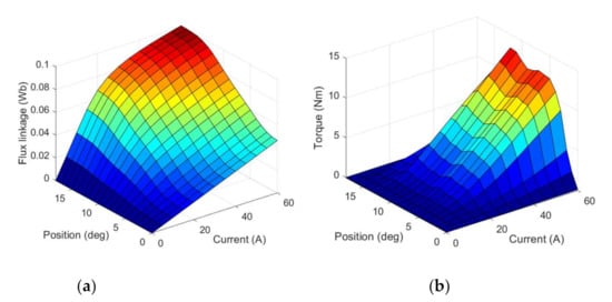 (a) Flux linkage prediction based on MCC-LSSVR model with respect to phase current and position angle, (b) torque prediction based on MCC-LSSVR model with respect to phase current and position angle.