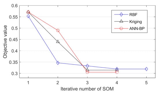 Convergence processes of sequential optimization method (SOM) with three surrogate models (RBF, Kriging, and ANN) for the optimization of SMES.