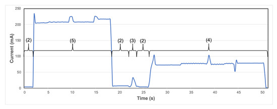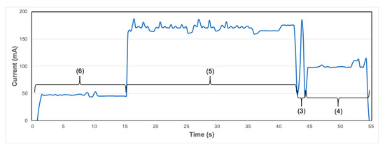 Node type A had a standby consumption of 1.1 mA. Figure 5 shows the current required in each of the states through which the node passes in operating mode (i). The measured current and the duration of each of these states are shown in Table 3. With these values, taking into account the standby current, the total consumption of the mode has been calculated with Equation (1).