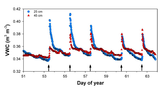 Evolution of VWC sensors at 25 and 45 cm depth measured by node 04 with 10HS sensors (year 2020). The arrows indicate the irrigation events.