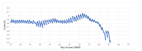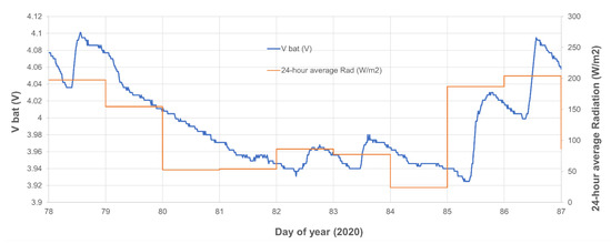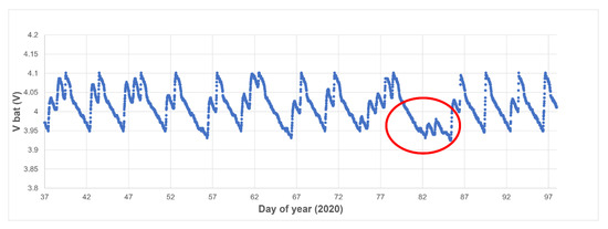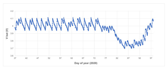 The evolution of the battery voltage of the nodes is a useful indicator of the “health” of the node. As an example, Figure 14 shows the evolution of the battery voltage of one of the nodes (node 25) in typical conditions. As can be seen, the battery management algorithm starts the charge when the voltage falls below the lower threshold (3.95 V) and stops when the upper threshold is reached (4.1 V). In this way, it works within the optimum voltage range for the battery and reduces the charge cycles, extending its useful life. During the charge there are different voltage peaks corresponding to the daylight hours (the solar panel supplies charge) and the hours of darkness during the night (there is no photovoltaic generation and the battery discharges due to the node consumption). The “discrepancy” that appears between days 82 and 87 (22 and 27 March 2020) corresponds to days when solar radiation was lower due to the existence of cloudiness (see Figure 15).