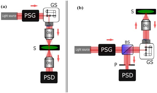 Block diagram for implementing a general Mueller matrix (MM )polarimeter into a scanning laser microscopy (SLM) architecture (a) in transmission and (b) in confocal reflection configuration. PSG: polarization states generator. Obj: microscope objective. GS: galvanometric scanner. TL: tube lens. S: sample. BS: beamsplitter. P: pinhole. PSD: Polarization States Detector.