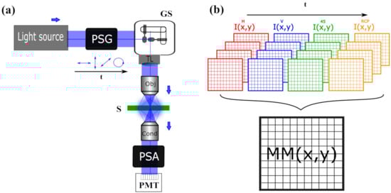 (a) Block diagram of a typical MM SLM configuration based on the sequential encoding/decoding of the polarization states from Reference [45]. (b) Schematic presenting the extraction of the MM images from the measured intensities images in the sequential approach. PSG: polarization states generator. PSA: polarization states analyzer. Obj: microscope objective. Cond: Condenser. GS: galvanometric scanner. TL: tube lens. S: sample. PMT: Photomultiplier tube. t: temporal polarization states generation. , , , : intensities collected at the generated horizontal, vertical, 45 and Right Circular Polarization (RCP) polarized states.