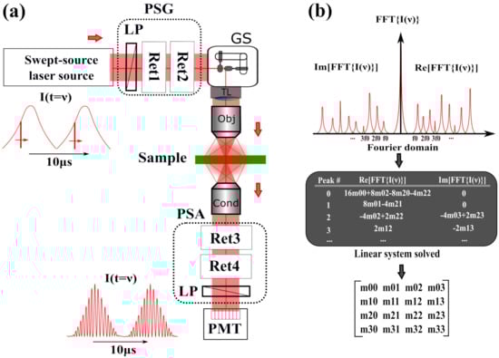 (a) Block diagram of a MM SLM based on the spectral encoding/decoding of the polarization states from Reference [31]. (b) Schematic presenting the extraction of the MM images of the measured intensities images in the spectral approach. PSG: polarization states generator. PSA: polarization states analyzer. Reti: retarder. Obj: microscope objective. GS: galvanometric scanner. TL: tube lens. S: sample. PMT: photomultiplier tube.