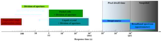 For wide field imaging, the solution has been found by using multiple electro-optics devices in series such as Photoelastic Modulators (PEMs) or PC triggered with the camera frame rate via a data acquisition (DAQ) board [53]. Briefly, the method is based on the analysis of the time-variation of the intensity induced by the electro-optics effect. Thus, the detected signal is a channeled spectrum represented in the Fourier domain by complex modulation amplitudes at numerous frequencies. A 50 MHz FPGA counts the edges of each PEM modulation signal and locks when a unique phase between all the four PEMs is occurring within a short time in a nanosecond timescale. Then, the FPGA sends a trigger to the CCD to gate the signal in 0.5 s, giving a full image acquisition took in approximately 20 ms. Another approach consisting in dealing directly with the Fourier transform of such modulated signal where the complex amplitudes are linear combinations of the MM elements [54]. In this method, the common approach is to choose different PEMs with separated working frequencies. This kind of optical device is composed of a passive crystal subjected to periodic mechanical stress, resulting in a time-varying birefringence due to the photoelastic effect [28,55]. In numerous earlier works, polarization-resolved setups used one PEM with an LP oriented orthogonally as a PSG for measuring the differential circular polarized intensities [33,36,56]. Coupled with a lock-in detection at the reference frequency of the PEM, the passive setup was able to provide few elements of the MM in order of tens of kHz. In order to speed up the acquisition rate and the number of elements, common solutions proposed to add another PEM in the PSA synchronized with the first one [57]. In recent works, this technique upgraded such a measurement by dealing with 3 and 4 PEMs [58]. The main advantage brought by adding multiple PEMs is that all the elements of the MM can be retrieved without any mechanical moving part. Thus, this experimental approach has been proven to be of interest for studying ultrafast conformational changes in biopolymers [59,60]. For such a technique, the acquisition speed has reached 100 s (10 kHz repetition rate), very close to the pixel dwell time from any GS.
