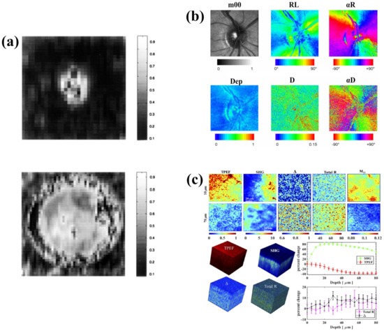 Quantitative imaging of the full Mueller matrix for ophtalmology applications. (a) Degree of polarization images of the retina for two different size of pupil. (b) Polarization parameter images of the optical nerve head. These images corresponds to the normalized average intensity m00; linear retardance—RL; retardance orientation ; depolarization index Dep; diattenuation D; diattenuation orientation . and (c) Quantitative analysis of a rat cornea polarization resolved image. Top two rows correspond to images at 10 and 70 m depth while bottom row shows 3D volume of Second Harmonic Generation (SHG) and Two-Photon Excitation Fluorescence (TPEF), and percent change. Adapted with permission from: (a) [44]; (b) [49]; (c) [52], © The Optical Society.