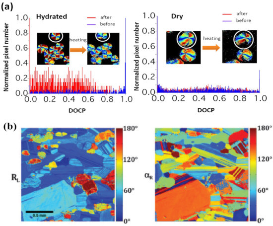 Quantitative MM images taken from material science applications. (a) Comparative study of the SHG images of hydrated and dry starch granules after heating. (b) Linear retardance RL, and its orientation of a gabbro rock section. Adapted with permission from: (a) [50], Scientific Reports, under a Creative Commons license (http://creativecommons.org/licenses/by/4.0); (b) [31], © The Optical Society.