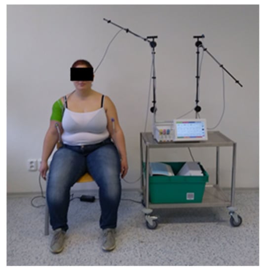 In the initial position of sitting with the support of the back of the chair, legs supported by the soles on the floor and the upper limbs hanging down, electrodes of Précise 8008 were glued to the body. Two electrodes were always applied to musculus biceps brachii both on the right upper limb (RUL) and the left upper limb (LUL). A position in the medial line on the ventral side of the arm in the middle of the distance between the acromion and the medial epicondyle of the humerus was chosen to place the electrode on musculus biceps brachii.