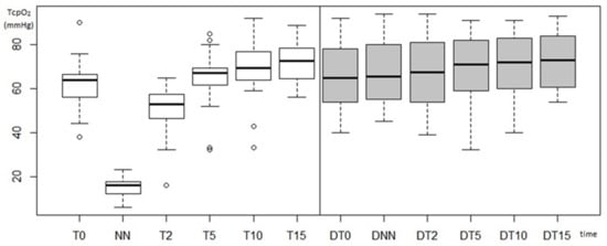 The transcutaneous oximetry method was used in the analysis. “Determination of transcutaneous oxygen tension (tcpO2) is the method for testing peripheral skin perfusion at the capillary level based on measurement of the partial pressure of oxygen diffusing through skin” []. From the measured values it is possible to derive the absorption capacity of systems and the amount of dissolved oxygen in tissue, which informs us about the blood supply at the capillary level [,]. Transcutaneous monitoring measures the partial pressure on the skin surface, from which it is possible to infer the partial pressure of oxygen in arterial bed (paO2). Thus, it is not a direct measurement of paO2, while the arterial pressure of oxygen is usually higher than the pressure measured transcutaneously. TcpO2 can be well used for long-term non-invasive monitoring of tissue perfusion [].