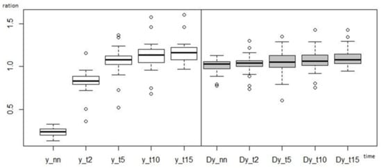 Figure 4 shows the change in blood flow over time in relative terms. In this case, standard deviations are significantly lower than in the case of expression using absolute values (Figure 3). Although even here there are extreme values that stand out from the otherwise uniform set.