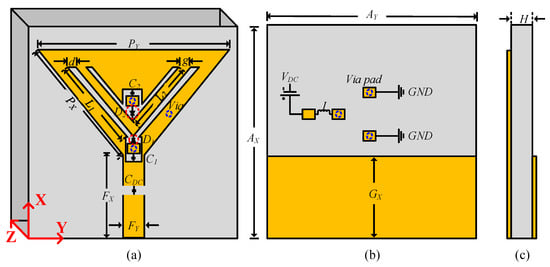 The geometrical configuration of the proposed antenna is illustrated in Figure 1. The antenna is designed using ROGERS RT/droid 6010 having dielectric loss tangent (tan δ) of 0.0023, relative permittivity (εr) of 10.2 and 1.9-mm thickness (H) [18]. The overall dimension of the reconfigurable antenna is AX × AY. It can be seen from Figure 1a that the proposed monopole antenna consists of a triangle-shaped radiator having a dimension of PX × PY and the feed line dimension is FX × FY. Two V-shaped slots were etched to notch the desire bands from wide bandwidth, the total length of the long slot is 2 × L1, whereas the length of the shorter slot is 2 × L2. The width of both slots had a dimension of d while the gap between two slots is g. A truncated ground plane of length GX was used to achieve wideband operational bandwidth. Table 1 shows the optimized parameters of the antenna.