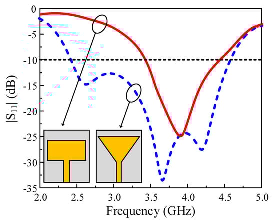 The resultant antenna resonates at 3.8 GHz with an impedance bandwidth of 850-MHz ranging 3.55–4.4 GHz, as depicted in Figure 2. Although the antenna offers a wide impedance bandwidth, still it does not cover the targeted 5G sub-6-GHz band (3.1–4.5 GHz) allocated globally for future wireless communications. Thus, perturbation techniques were utilized to widen the impedance bandwidth of the antenna. Different from common techniques including DGS and slots to achieve wideband behavior, this design employed truncation of radiator corners to improve the bandwidth. Both lower corners were truncated using an equilateral triangle which results in increasing the effective length of the radiator, thus shifting of resonance toward the lower frequencies, as depicted in Figure 2. Moreover, truncation of the corner causes more current to flow from the feedline to the radiator. Due to the triangular shape, the current uniformly distribute itself on the surface of the radiator. The increase in flow and uniform distribution of current resulted in improvement in impedance matching at lower frequencies to enhances the impedance bandwidth of the antenna. The resultant antenna exhibits a wide impedance bandwidth of 2.2 GHz ranging 2.35–4.55 GHz which corresponds to 62.8% of central frequency, as depicted in Figure 2. It is worthy to note here that besides 5G sub-6-GHz band spectrum the antenna also covers 2.4 GHz WLAN band, 2.45 GHz ISM band, 2.5GHz Wi-Max band, and more than 90% of S-band (2–4 GHz), thus making it suitable for multiple applications.