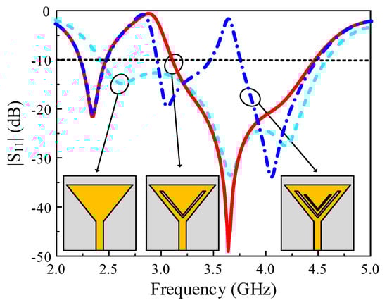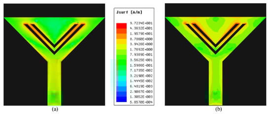 where (n) = 1, 2 which shows the number of slot while . Moreover, for the proposed work LS1 = 2 × L1 while LS2 = 2 × L2. Figure 3 illustrates the comparison between simulated values of S11 for wideband antenna and antenna with a single and dual notch. It could be observed that with a single V-shaped slot the antenna mitigates the band spectrum of 2.47–3.11 GHz having a maximum value of S11 = −0.78 dB at 2.82 GHz. Similarly, when two slots were etched, the antenna mitigates the two band spectrums of 2.48–2.96 GHz and 3.47–3.76 GHz. To have a better understanding of the slot to mitigate the desired frequency, current distribution plots were presented in Figure 4a,b. It could be observed from Figure 4a that for the first notch band the maximum current is around the bigger V-shaped slots, which causes the mitigation of the lower band. Similarly, the maximum current was observed along with a smaller V-shaped slot for the second notch band, which causes its mitigation from the resonating band spectrum.