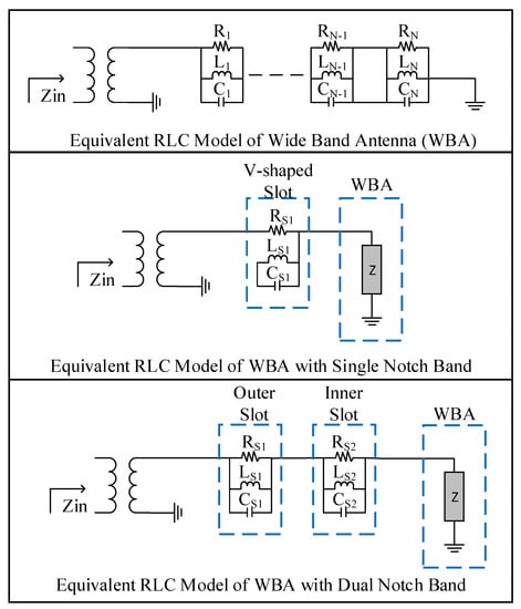 Figure 5 depicts the equivalent circuit of the UWB antenna along with the UWB antenna with a single and dual-notch band. The equivalent model of the UWB antenna was designed using a series-connected combination of RLC components, where each group of RLC components show the independent single resonance. The operational region of each resonance overlaps due to closely spaced thus results in a Wide Band Antenna (WBA) [30,31]. Similarly, the notch bands occurred due to the presence of V-shaped slots were also model using an RLC group, where the LC equivalent notch frequency fno [32].