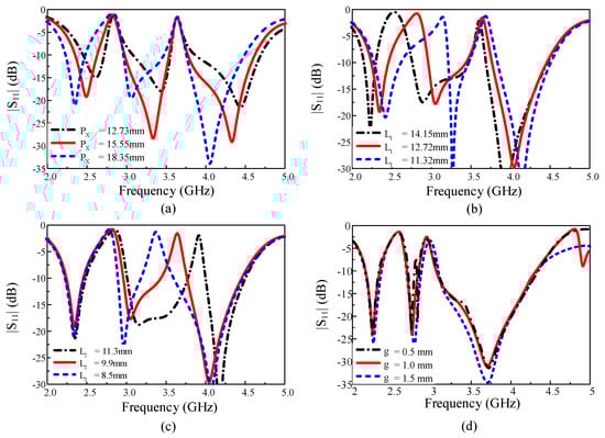 Parametric analysis of the various parameters of the antenna: (a) PX (b) L1 (c) L2 (d) g.