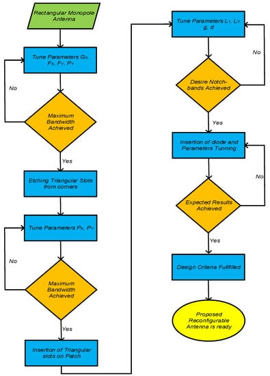 Figure 7 depicts the flow chart of the design methodology of the proposed antenna. Initially, a quarter-wave rectangular monopole antenna was designed. Various parameters of monopole, including length and width of the radiator, feedline, and truncated ground plane, were optimized to get maximum bandwidth. Afterwards, lower corners of the monopole radiator were truncated by using an equilateral triangle such that the hypotenuse of the triangle is PX.