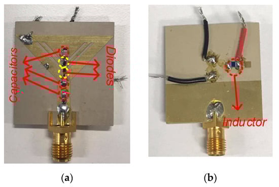 The simulations of the proposed frequency reconfigurable antenna were performed using Higher Frequency Structural Simulator (HFSS). For frequency reconfigurability two RF PIN diodes D1 and D2 (Infineon, model # BAR50-02) were utilized. Two capacitors C1 and C2 were used to connect the pads with the radiator physically and to block current flow from biasing pads to the radiator. Capacitor CDC is utilized to stop the flow of current toward the connector which may affect the performance of the antenna. The pads for diode are connected using a vias to biasing pads presented at the backside of the antenna, as depicted in Figure 1b. Inductor I is employed to stop the unwanted RF-current from the source VDC. The biasing voltage is provided from the backside of the antenna to mitigate the effects of DC-wires on the performance of the antenna.