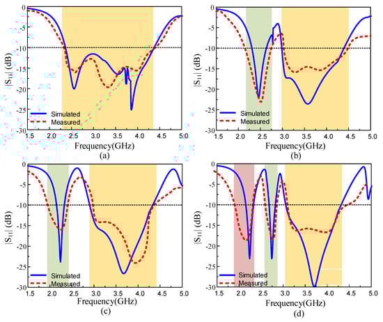 On the other hand, the measured S11 < −10 dB bandwidth for case-01 was observed to be 2.1–2.78 GHz and 3.09–4.57 GHz, respectively, as depicted in Figure 9b, while for case-10 it was observed to be 1.86–2.5 GHz and 3.03–4.47 GHz, as depicted in Figure 9c. At last, when both diodes were kept in Off-state, referring to case-00, the antenna exhibits triband operational mode having predicted passbands of 2.17–2.35 GHz, 2.64–2.85 GHz, and 3.09–4.34 GHz. The measured impedance bandwidths for case-00 were reported to be 1.93–2.4 GHz, 2.62–2.97 GHz, and 3.2–4.65 GHz, as depicted in Figure 9d. In general, a strong agreement was observed between simulated and measured results, while the small discrepancy between the results was owing to fabrication and measurement circuitry.