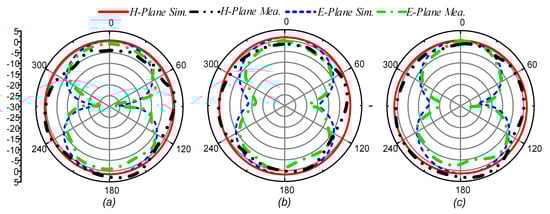 Simulated and measured radiation patterns for case-00: (a) 2.24 GHz (b) 2.74 GHz (c) 3.71 GHz.