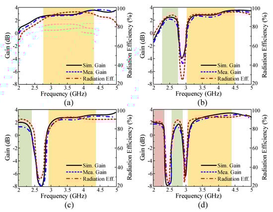 Figure 11 shows the predicted and measured gain of the proposed reconfigurable antenna. It can be seen from Figure 11a, when both diodes are in ON-state the antenna exhibits a gain of <2.5 dBi in the operational band along with radiation efficiency of <90%. However, the antenna in multiband mode shows the gain of <2.4 dBi in passband regions along with radiation efficiency of <89% (Figure 11b–d), while for the band stop region the gain and radiation efficiency of the proposed antenna decreases up to −8 dBi and 22%, respectively. A strong agreement between simulated and measured results state the performance stability of the antenna. Table 2 shows the comparison between measured and simulated results for different states of PIN diodes.