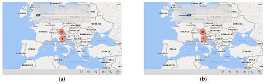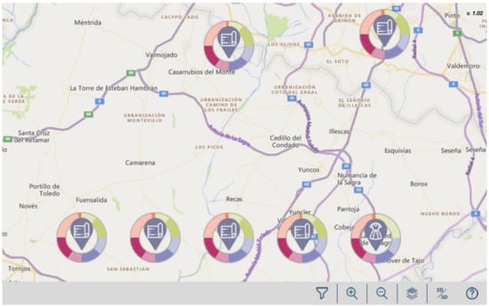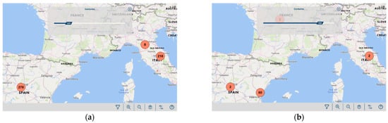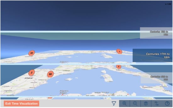 Most of the previously shown strategies take place in the rendering step of the InfoVis pipeline. Of course, the rendering step is not the end of the visualization process. User interaction is also necessary for users to control and filter the information they want to see. Time information is commonly addressed in this manner, since a map often represents the situation in a particular time. One of the most used interactive strategies is the use of a timeline, which allows controlling the time frame in which the spatial visualization occurs [,,,,,,]. This strategy is frequently used in CH, since in this type of applications is often necessary to see different time periods, and switch between them interactively. It is usually possible to see a broad time level and zoom-down interactively to a concrete time period [] or even to a precise month or day [].