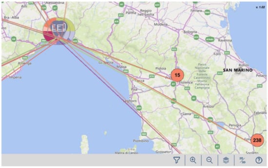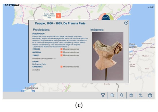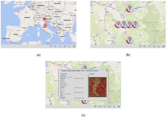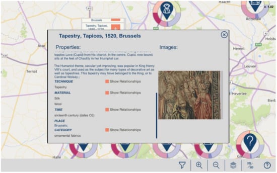 SILKNOW is a multidisciplinary project aimed at preserving and promoting the heritage of silk textiles. For this reason, digital data about silk textiles from the databases of several institutions (museums, manufacturers, associations etc.) have been processed and analyzed with Artificial Intelligence (AI) techniques []. These data have been incorporated into the SILKNOW’s knowledge graph in order to allow queries from a public web site and also to virtually weave the textile with a software called Virtual Loom [,]. The results of these queries are presented in standard web format, but it is also possible to create a visual representation of these data in the form of an interactive map. This component is the STMaps tool. STMaps receives datasets from the SILKNOW’s knowledge graph (or any other knowledge graph from other DO) and shows them on a map. The data should have spatio-temporal information and be previously filtered, as is done by SILKNOW’s search tool—called ADASilk []—so that the items visualized correspond to the interest of the user.