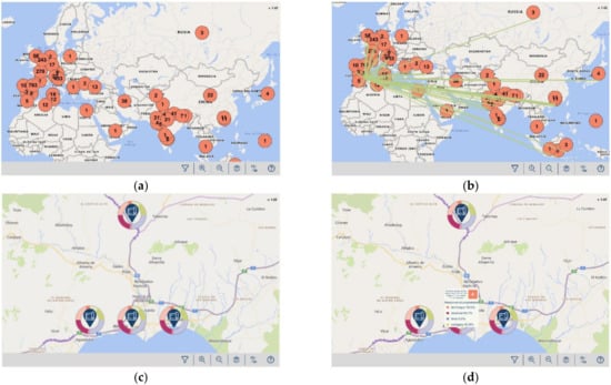 As technology advances and gets more complex, so do data. Indeed, with increasingly complex information models, data tend to have many more attributes. For this reason, new ways of classifying and visualizing spatio-temporal data arise, such as the one proposed in []. In this work, Guo added the who dimension to the Peuquet’s proposal. This new dimension refers to objects, and the what dimension refers to the attributes of these objects. These four dimensions can be queried simultaneously or in combinations, performing queries with four different levels of complexity. The more dimensions are combined, the more filtered data are, and the easier they will be to visualize. On the contrary, the fewer dimensions are used, the more information will be shown, reducing the understandability of the analysis.