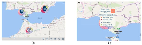 In addition, in CH, it is not uncommon to have objects that are poorly or loosely classified in terms of spatio-temporal properties. Some geographic and temporal data could be missing, fuzzy, incomplete, duplicated or even wrong, since it is not always possible to be certain about the origin and age of CH-related items. Small- and medium-sized museums do not always have the required resources to properly document their objects. This poses an additional challenge for the visualization of spatio-temporal data. Indeed, showing items that may have duplicated or incomplete spatio-temporal properties requires special strategies to be able to effectively communicate these situations to the user and show the relationship between the duplicated or incomplete information. Although this problem has been previously studied [,,], very little attention has been put in visualizing this type of CH-related information []. Although the visualization of the uncertainty in data may increase significantly the complexity of the visual representation, its omission can also create obvious problems. For this reason, a trade-off between visual complexity and visual accuracy should be found []. This trade-off depends on the objectives and the audience of the visualization tool. For instance, visualization for edutainment could hide this complexity, whereas professional/scientific tools should take the risk of visualizing this uncertainty. In this paper, we bring a strategy to represent this uncertainty by mapping the objects in their multiple locations and time spans, but indicating this uncertainty with the symbology. We follow the guidelines proposed in [,].