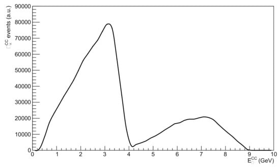 where N is the number of neutrino interactions observed in the detector for a reconstructed neutrino energy , is the neutrino cross section at the true energy E for a given flavor (), is the probability to detect a neutrino with energy E and reconstruct it at the energy , and is the neutrino flux of that flavor expressed in neutrinos/ms. The coefficient that links the left and right side of Equation (1) is the number of scattering centers crossed by the neutrinos and is, therefore, very well known from the detector mass.