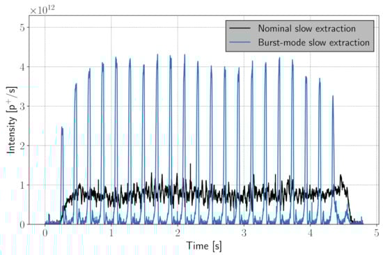 Comparison between a nominal slow extracted spill and a “burst-mode slow extraction” one. The spill profiles have been measured with a secondary emission monitor at the SPS, during dedicated machine tests. The same intensity is extracted in the two cases.