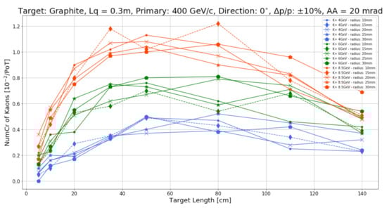 An interesting example is an optimization performed for monitored neutrino beams and, hence, slowly extracted beams, by ENUBET. The team has conducted extensive optimization studies based on the FLUKA [95,96] and G4beamline [97] simulation codes, using graphite (density g/cm), beryllium (density g/cm), Inconel (density g/cm) and some high-Z materials. Each target prototype is modeled geometrically as a cylinder with variable radii between 10 and 30 mm and various lengths extending from 5 to 140 cm.