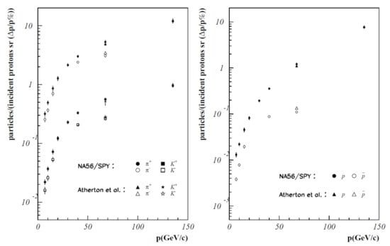 In practice, both the knowledge of the cross-sections and the yields (typically performed with replica targets) is crucial for the correct normalization of the number of hadrons and, hence, neutrinos. The experiments performed in the 80s and 90s were mostly mass spectrometers with a narrow acceptance and excellent particle identification [15]. This choice was driven by the fact that the experiments were not designed as hadron production facilities but were based on existing experiments studying standard or exotic QCD processes. A renowned example is NA56/SPY [101] at CERN that took data in 2002–2003 modifying NA52: a high precision mass spectrometer for the searches of strangelets in ion-ion interactions. Despite these limitations, SPY produced essential results (see Figure 5) for the design of the CERN-to Gran Sasso (CNGS) neutrino beam and the interpretation of the NOMAD data [27], both based on primary protons at 450 GeV (the CERN SPS). The most precise data were taken on Beryllium in a secondary momentum range from 7 to 135 GeV/c and values up to 600 MeV, where a precision of 5–10% was achieved. The ratio was measured in this momentum range with a typical precision of 3%. Even if the precision achieved was quite high, the limited acceptance and the choice of thin beryllium targets increased the systematic budget when applied to real neutrino experiments due to the extrapolation to thick targets of different materials. SPY was, hence, useful in the design phase of CNGS to estimate the expected neutrino rates but did not constrain the actual neutrino flux below 25%.