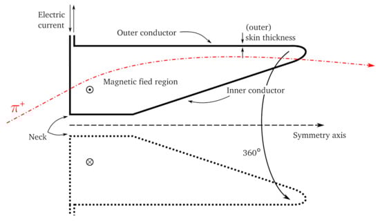 Magnetic horns were first proposed by S. van der Meer in 1961 [107] and, since then, have been employed by all wide-band neutrino beams at the GeV scale. A horn is composed of conductor sheets on which a current flows in the longitudinal direction during the proton extraction, producing a strong magnetic field. A schematic representation of the device is reported in Figure 6.