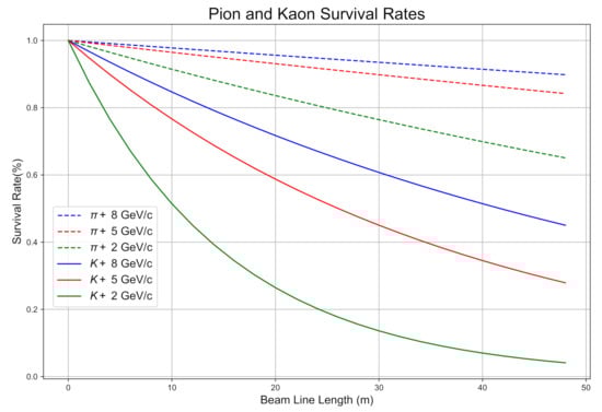 A typical secondary beamline consists of three different “stages” constituting different elements. A schematic illustration of the basic stages is shown in Figure 1. All the designs of the hadron beamlines need to take into account the decay probabilities of the unstable mesons (typically pions and kaons) that should not decay before the decay volume. As an illustration, for low energy neutrino beams (≤10 GeV/c) the survival probabilities for pions and kaons for a beamline length of 50 m is shown in Figure 7.