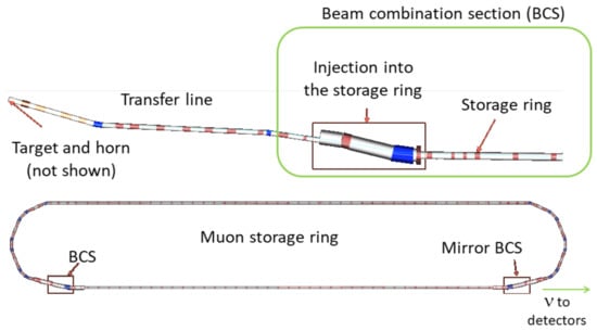 Several “non-conventional” neutrino beam concepts have been developed over the years. In these cases, the neutrinos are produced by leptons or by the -decays of partially ionized isotopes. The proposed Neutrino Factories [17] would create, accelerate and store in a ring charged muons, exploiting the decay channel. Here, the beam composition is precisely known to be 50% and 50% . If a Neutrino Factory were built, it would offer major advantages compared with conventional beams. Firstly, the number and polarization of the muons can be easily measured in the storage ring, offering superior control of flux and beam composition. Furthermore, the beam would be free of contamination because the neutrino flavors are uniquely determined by the muon decay products. Finally, a Neutrino Factory could be a powerful source of and , unlike conventional beams where and are always sub-dominant. A systematic review of the physics of Neutrino Factories is available in [18,19]. However, the technical challenges of a Neutrino Factory are tremendous. Due to the finite lifetime, the muons must be accelerated very quickly and the transverse momentum must be highly reduced (muon cooling) before injection into the storage ring [17,20,21].
