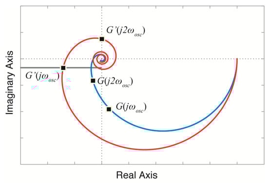 Once the effect of the additional delay is discounted by , the definitive points for the fitting are: G2(jωosc) = − 0.156146 − 0.807444j (φ ≈ 101°), G2(j2ωosc) = − 0.469391 + 0.107986j (φ ≈ 193°), G2(j3ωosc) = 0.004302 + 0.225650j (φ ≈ 271°), G2(j4ωosc) = 0.085876 + 0.040475j (φ ≈ 335°).