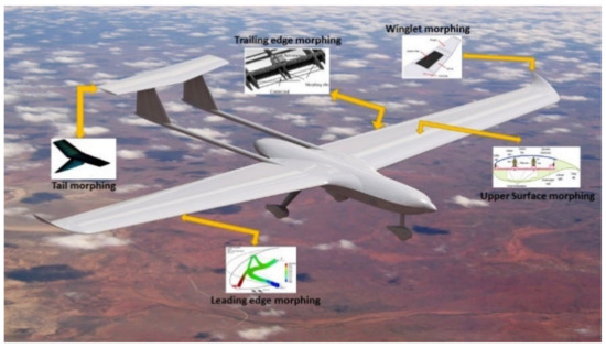 The morphing strategy scope is broad in the sense that an optimal solution can be generated in various ways with respect to a wide spectrum of mission profiles and types, and flight regimes. Novel technologies need to be part of recent efforts to produce environmentally sustainable and efficient aircraft. To meet environmental guidelines, including those of the International Civil Aviation Organization’s (ICAO’s) Committee on Aviation Environmental Protection (CAEP), innovative technologies such as “morphing” are fascinating as they provide advantages over conventional wing configurations [10]. Additionally, “morphing” is more practically applied in Unmanned Aerial Vehicles (UAVs) because of their reduced scale and lower complexity in terms of wing design structure and energy consumption expressed in terms of actuation power [6,11,12], in addition to the advantages that morphing designs are lighter and less noisy than their conventional designs. Some morphing opportunities with potential benefits for increasing aerodynamic performance of the UAS-S45 are shown in Figure 1.