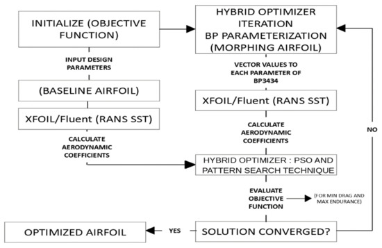 For this study, an optimization framework is designed to allow the integration of shape generation using the direct manipulation of the airfoil shape variables while respecting the geometrical constraints. The optimization procedure framework is described in Figure 2, and it consists of a parameterization block based on the Bezier–Parsec (BP) parameterization airfoil shape technique and an aerodynamic solver, such as the panel solver XFOIL (Version 6.99, MIT, USA, 2013 ). The validation of its results is done using high-fidelity solver in Fluent based on Reynolds-averaged Navier–Stokes (RANS) equations in the Transition SST model. A hybrid optimizer based on Particle Swarm Optimization (PSO) algorithm combined with the Pattern Search technique is also used. The optimization procedure is shown in Figure 2 and is described in detail in Section 2.1, Section 2.2, Section 2.3, Section 2.4.