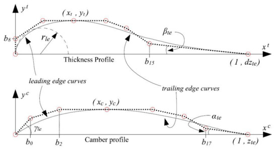 Parameterization of the airfoil shapes for the UAS design and optimization requires a mathematical formulation, and it becomes an important part of the overall optimization process. Studies have shown that the choice of shape parameterization technique has a strong influence on the solution accuracy, robustness and computational time of the overall optimization process [69]. In order to obtain an optimal aerodynamic solution, the shape function must be directly related to the airfoil geometry, have a flexible design space, and be robust for the control of all parameters. Some of the well-known methods are the Discrete Based Approach, the Bezier curves, the B-Spline or NURBS curves, the Cubic Spline and the Free-Form Representation [69,70]. The drawbacks of these methods are that they do not use airfoil shape parameters, they require a large number of design variables and they often provide inaccurate shapes for the leading edge and trailing edge of an airfoil.