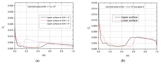 XFoil is a code for airfoil design and analysis consisting of inviscid, inverse and viscous formulations [75]. The viscous formulation can be used to calculate free or imposed forced flow transition to handle transitional separation bubbles, to calculate aerodynamic coefficients and to cope with moderately trailing edge separation. It uses an approximate eN envelope method to calculate the flow transition. The turbulence level settings are kept as default with free transition features. Both the boundary layer and the wake parameters are calculated with a two-equation integral boundary layer formulation as shown in Equations (8) and (9), respectively [76].