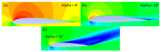 The validation of solvers and mesh settings is needed before carrying out the optimization studies. The validation studies were performed at a Reynolds number of 2.4 × 106 and a Mach number of 0.10. The range of angles of attack was considered from 0° to 16° to include the stall angle. The aerodynamic coefficients and the pressure distribution were obtained and further used for solution validation. A C-shaped computational domain with structured grids, as seen in Figure 4, was used in domain discretization after the performance of the mesh convergence test. The turbulence model used in this study was the Transition SST. This model uses a combination of SST K-ω coupled with intermittency γ and transition onset Reynolds number. is the critical Reynolds number where the intermittency starts [78]. Four transport equations of the Transition SST model are given below: