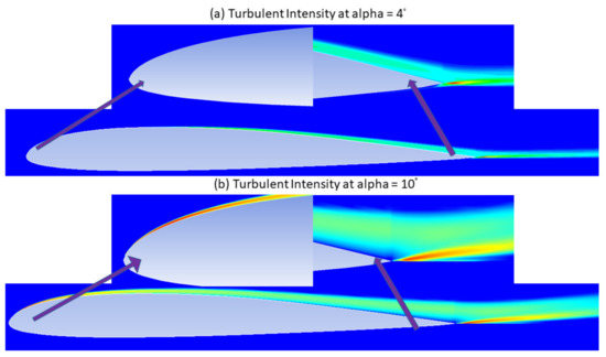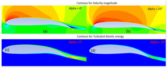 A freestream velocity of 34 m/s with a turbulence rate of 0.01 percent was imposed at the inlet. The surface of the airfoil was modelled as a zero-roughness no-slip wall, and its values were executed on the grid domain, which prescribed its motion relative to the rest of the computational domain. A symmetry boundary condition was applied to achieve a parallel flow at the top and bottom of the domain by assuming zero normal velocity and zero normal gradients of the flow quantities. A zero static gauge pressure was applied at the exit of the domain. Iterations were finalized when all scaled residuals were below 1 × 106.